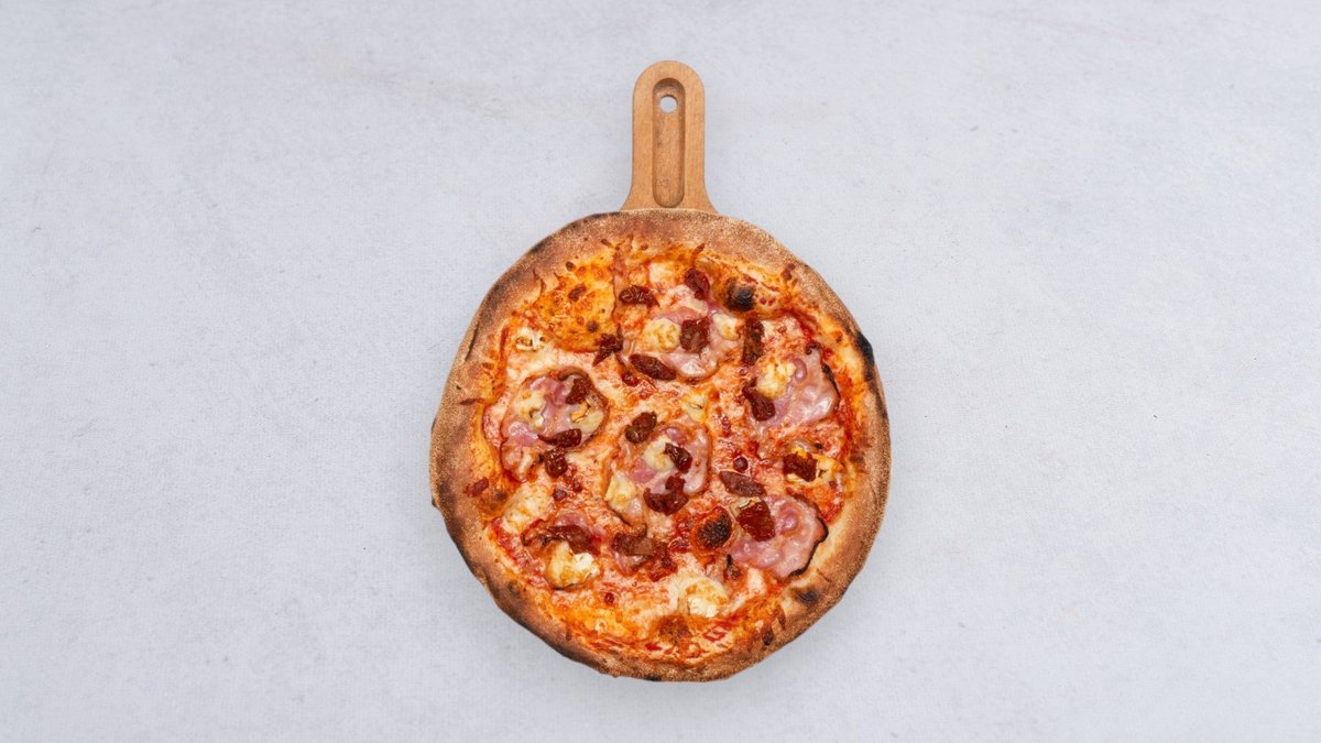 Z sosem pomidorowym, serem mozzarella, boczkiem pancetta, kozim serem i suszonymi pomidorami
