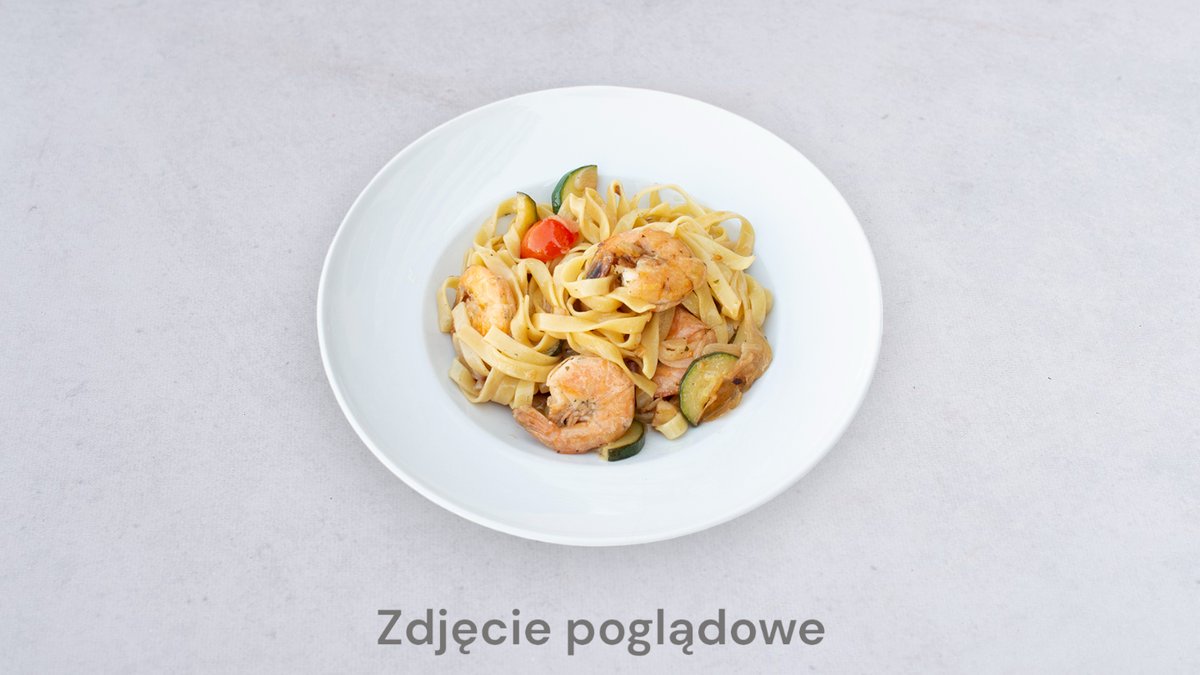 Z makaronem tagliatelle, sosem śmietanowym, krewetkami marynowanymi w czosnku, białym winem, solą, pieprzem i natką pietruszki