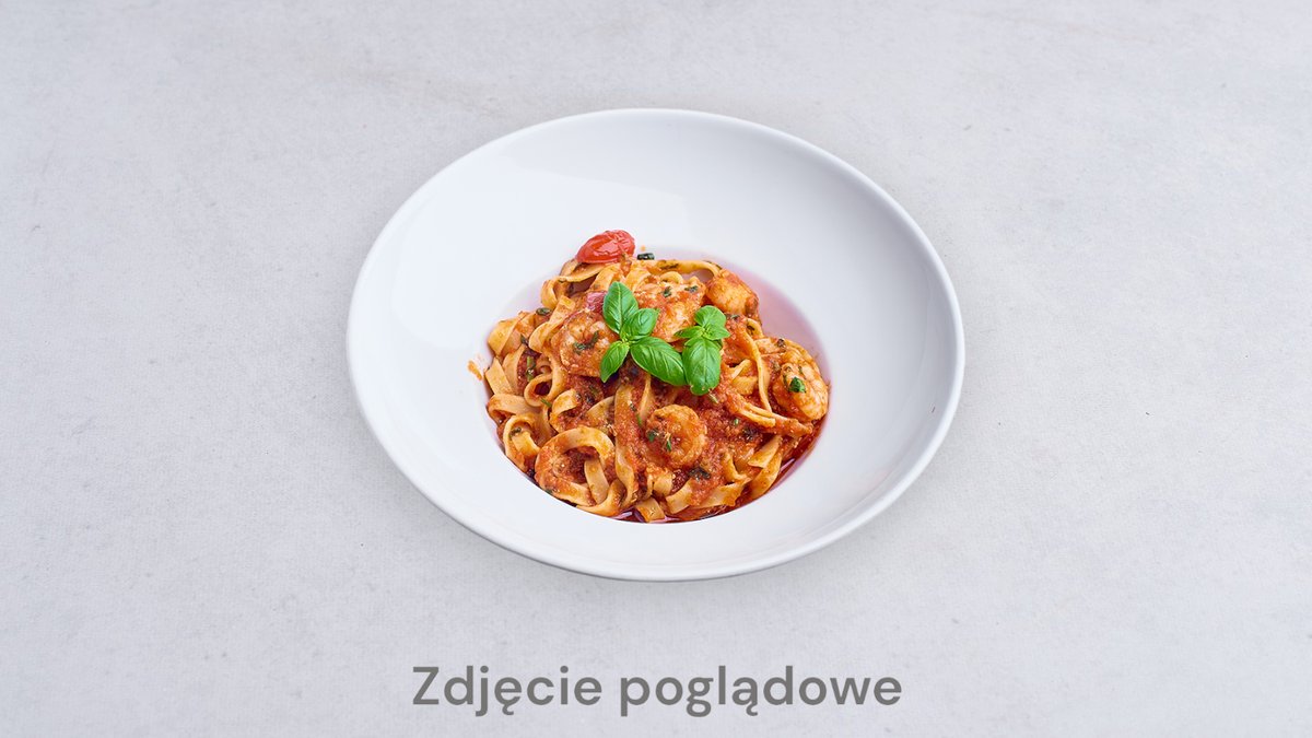 Z makaronem tagliatelle, sosem pomidorowym, krewetkami marynowanymi w czosnku, solą, pieprzem, pomidorkami koktajlowymi i rukolą
