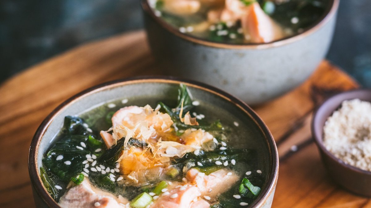 Łagodna zupa Miso z łososiem i kremem śmietankowym, wodorostami, grzybami, porem, sezamem. 500 ml