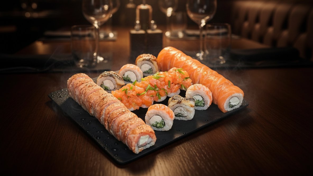 Philadelphia roll 10 sztuk California grill roll 10 sztuk Hosomaki łosoś 8 sztuk Hosomaki krewetka 8 sztuk Nigiri mix 6 sztuk