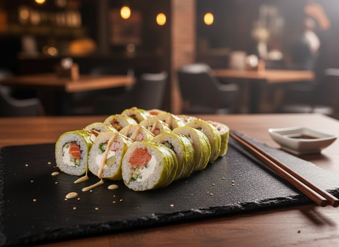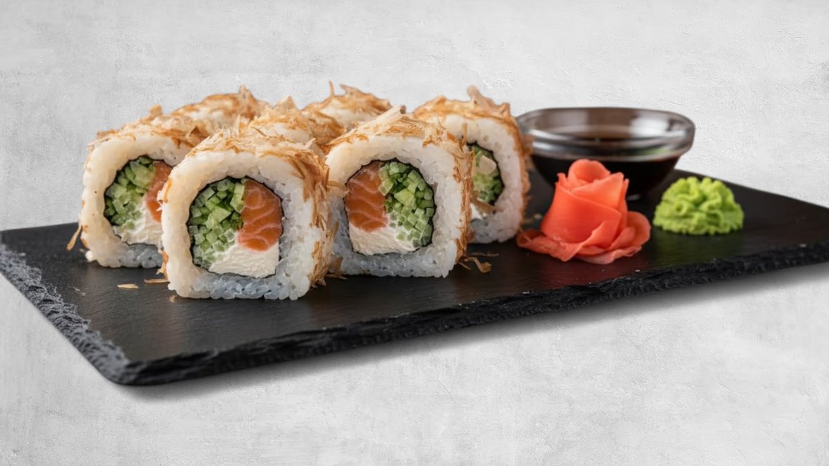 grillowany łosoś, serek, ogórek, kanpyo, słodki sos, migdały