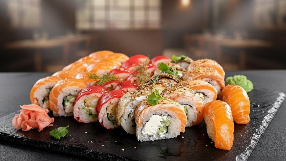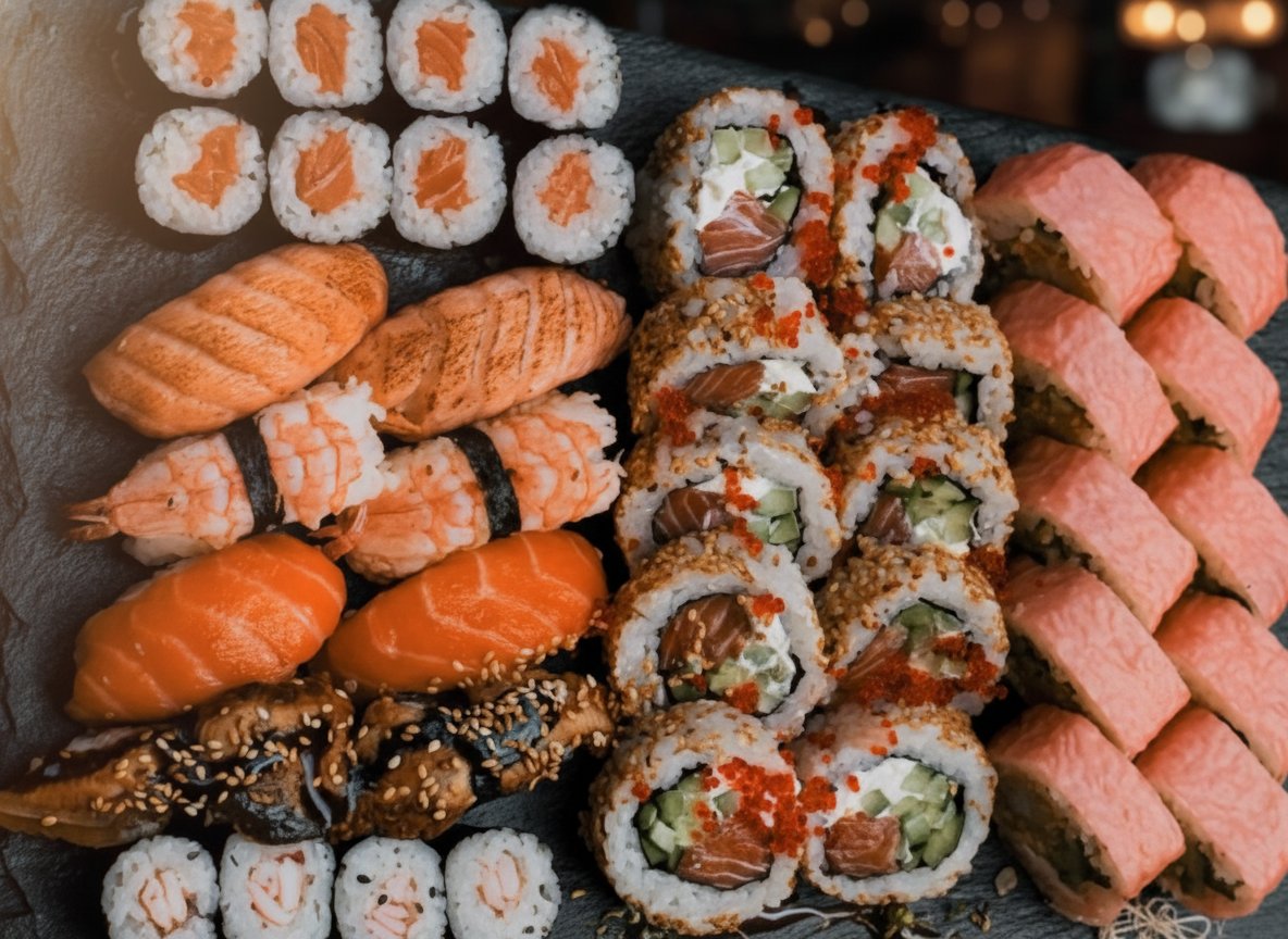 Philadelphia roll 10 szt. Philadelphia opiekany roll 10 szt. Ebi Ten roll 10 szt. Unagi roll 10 szt+ Nigiri węgorz 2 szt Nigiri łosoś 2 szt Hosołosoś 8 szt + Hosokrewetka 8 szt