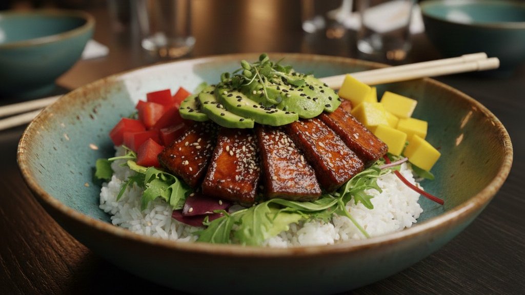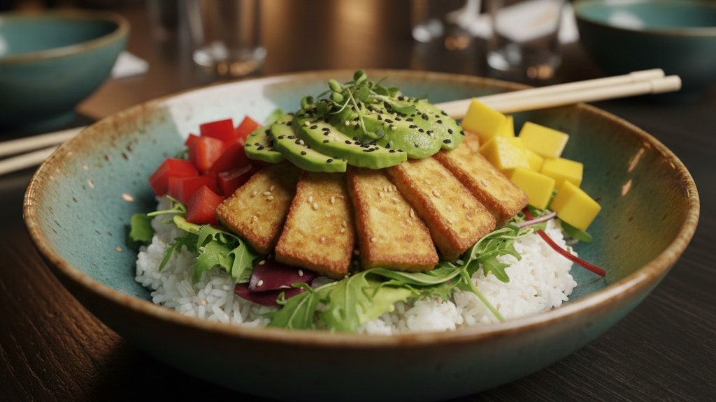 Tofu, ryż, sałata, ogórek, pomidory cherry, awokado, boby edamame, mango, sezam, sos 350 g
