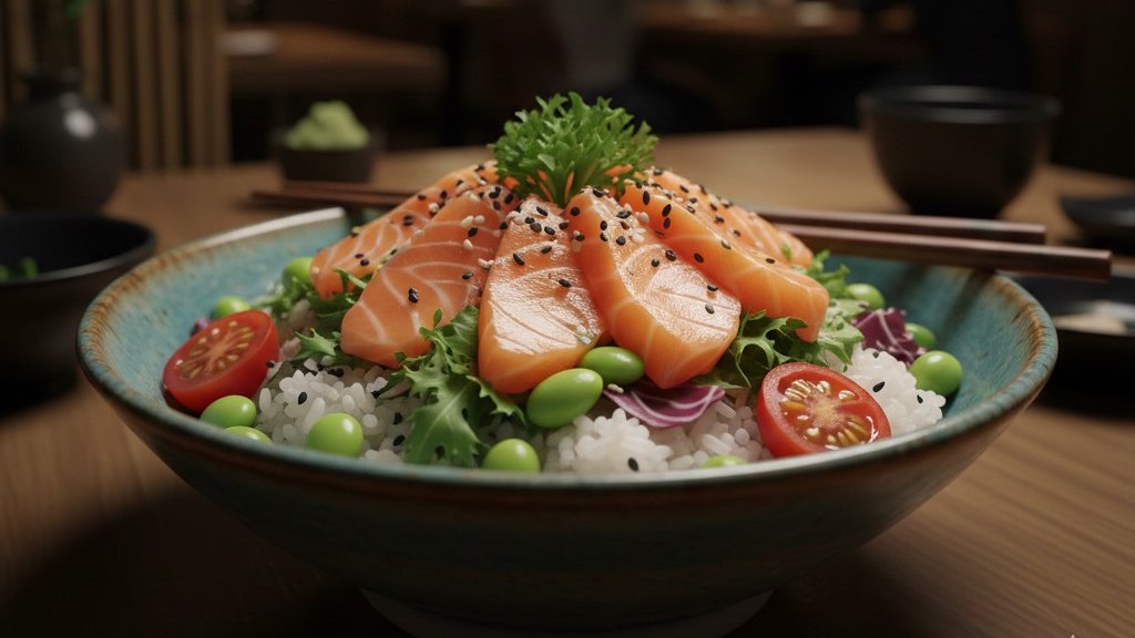 Świeży łosoś, ryż, sałata, ogórek, pomidory cherry, awokado, boby edamame, sezam, sos 350 g