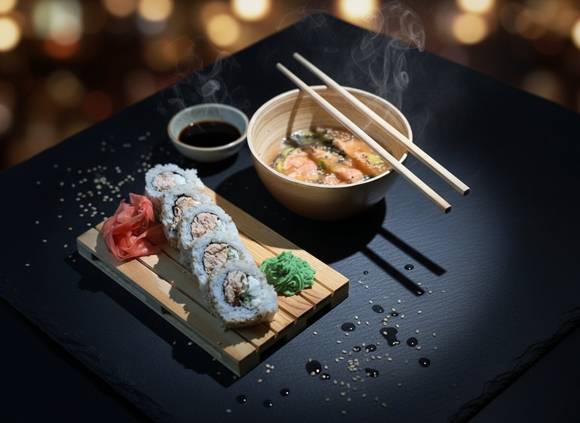 Imbir, wasabi, pałeczki, soja sos są w zestawie