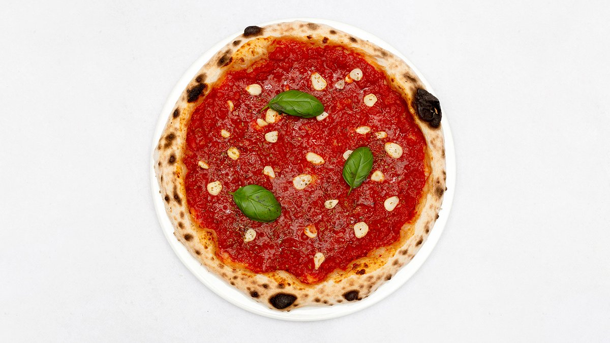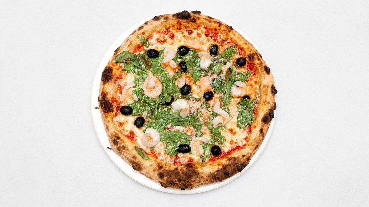 Sos pomidorowy, mozzarella fdl, krewetki, szpinak, oliwki, oliwa cytrynowa, grana padano