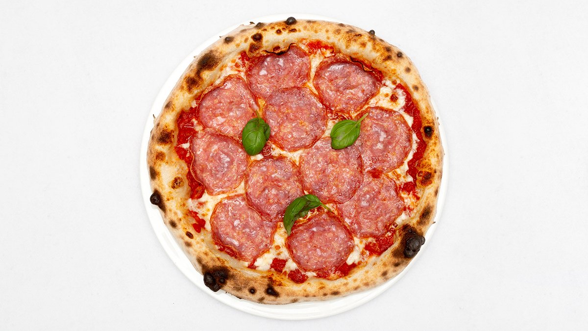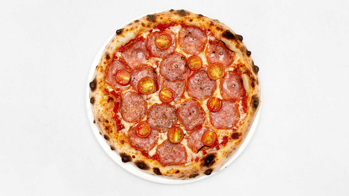 Sos pomidorowy, mozzarella fdl, salami napoli, pomidorki, oregano