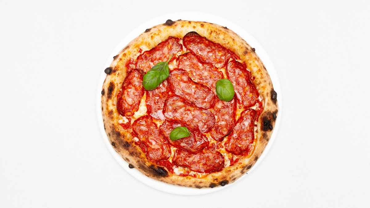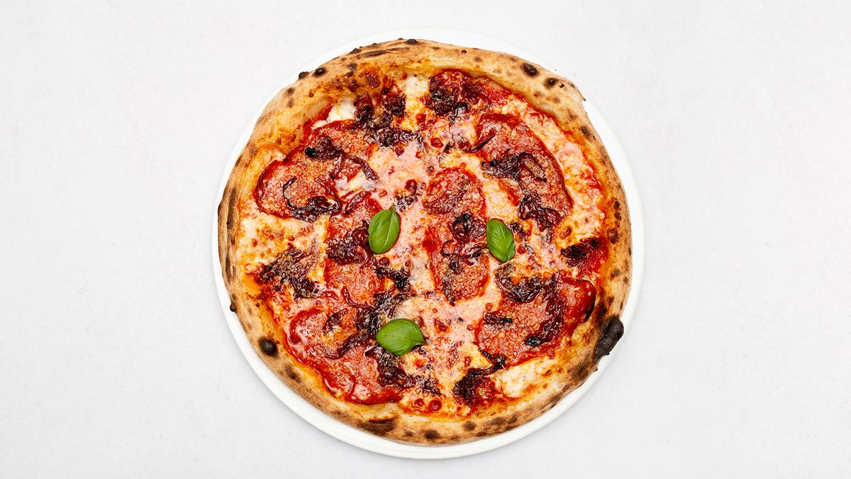 Sos pomidorowy, mozzarella fdl, salami spianata piccante, włoska pikantna kiełbasa 'nduja, karmelizowana czerwona cebula, bazylia, grana padano
