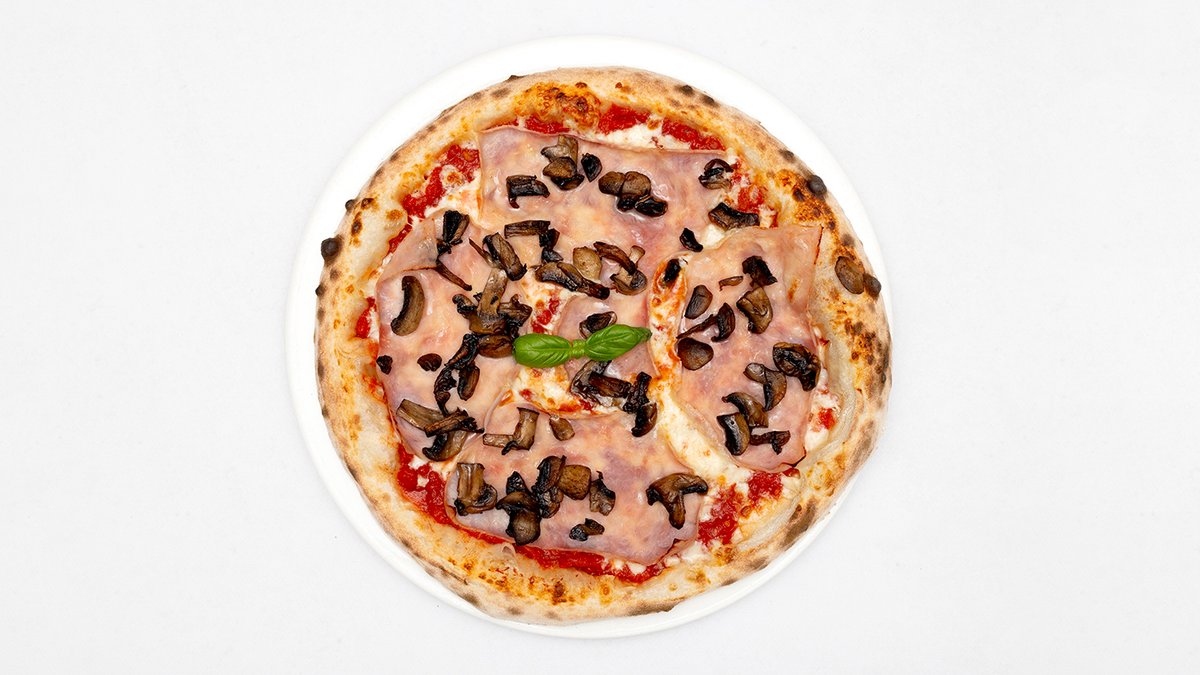 Sos pomidorowy, mozzarella fdl, pieczarki, szynka cotto, pieczarki