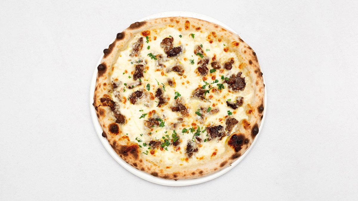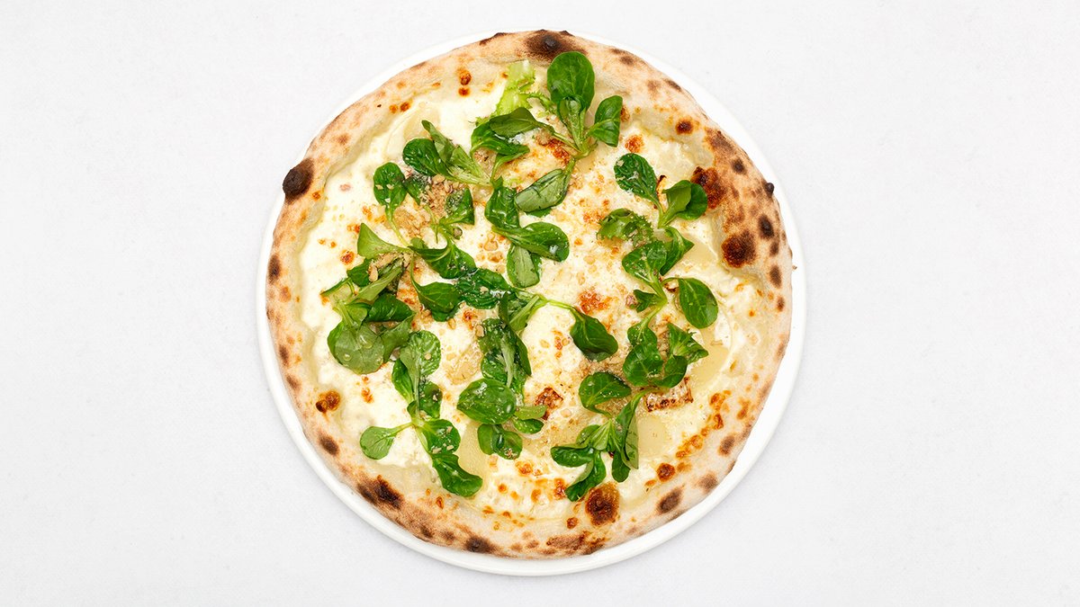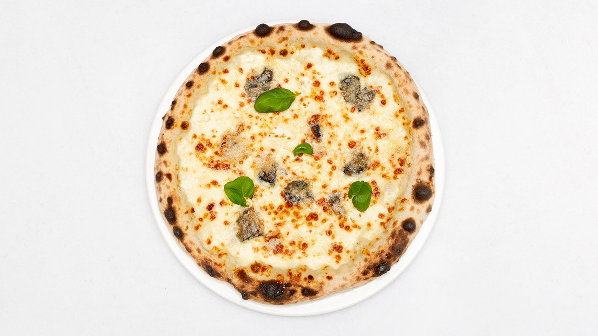 Sos śmietanowy, mozzarella fdl, grzyby leśne smażone z czosnkiem i rozmarynem, grana padano, oliwa truflowa, natka pietruszki