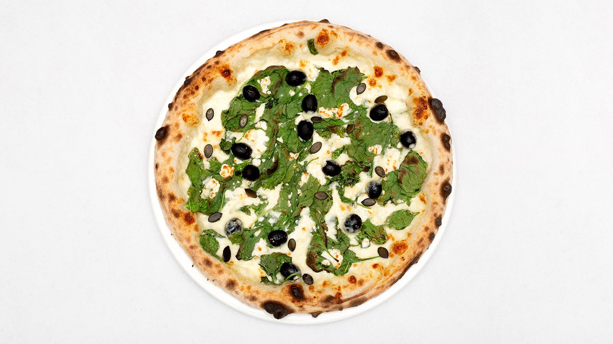Sos śmietanowy, mozzarella fdl, szpinak, feta, oliwki, pestki dyni