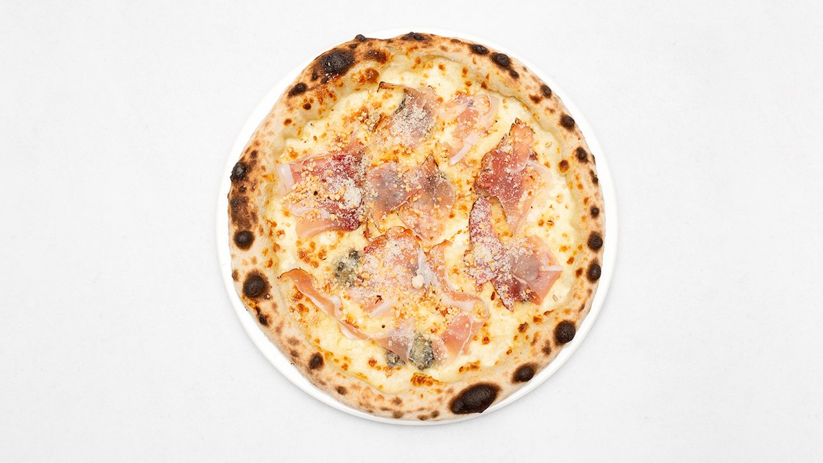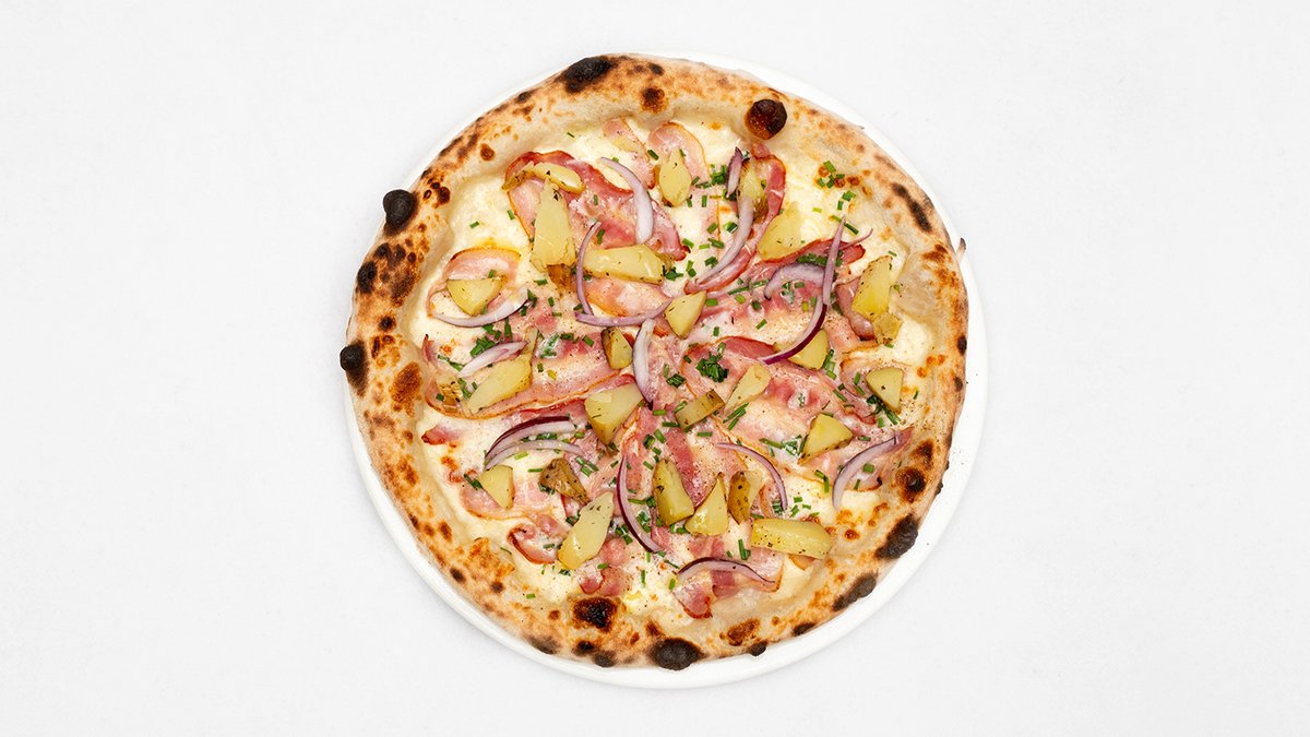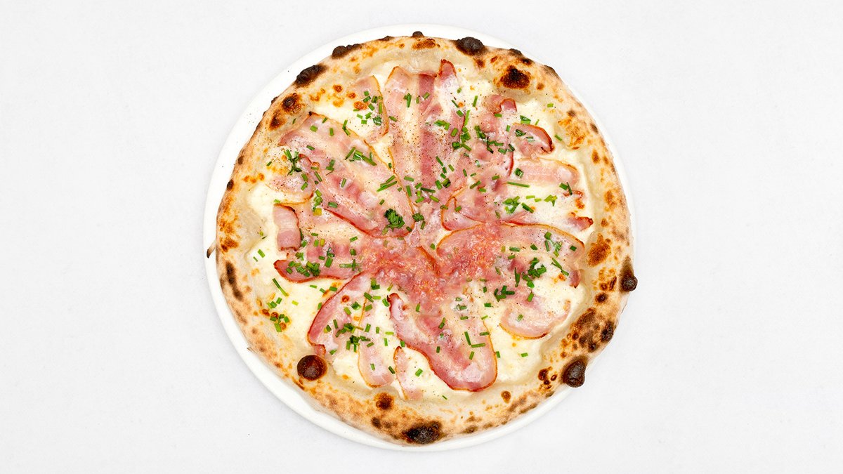 Sos śmietanowy, mozzarella fdl, boczek, jajko, szczypiorek, świeżo mielony czarny pieprz