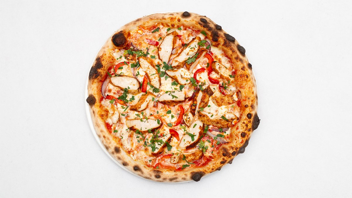Sos pomidorowy, mozzarella fdl, kurczak, papryka, czerwona cebula, feta, natka pietruszki