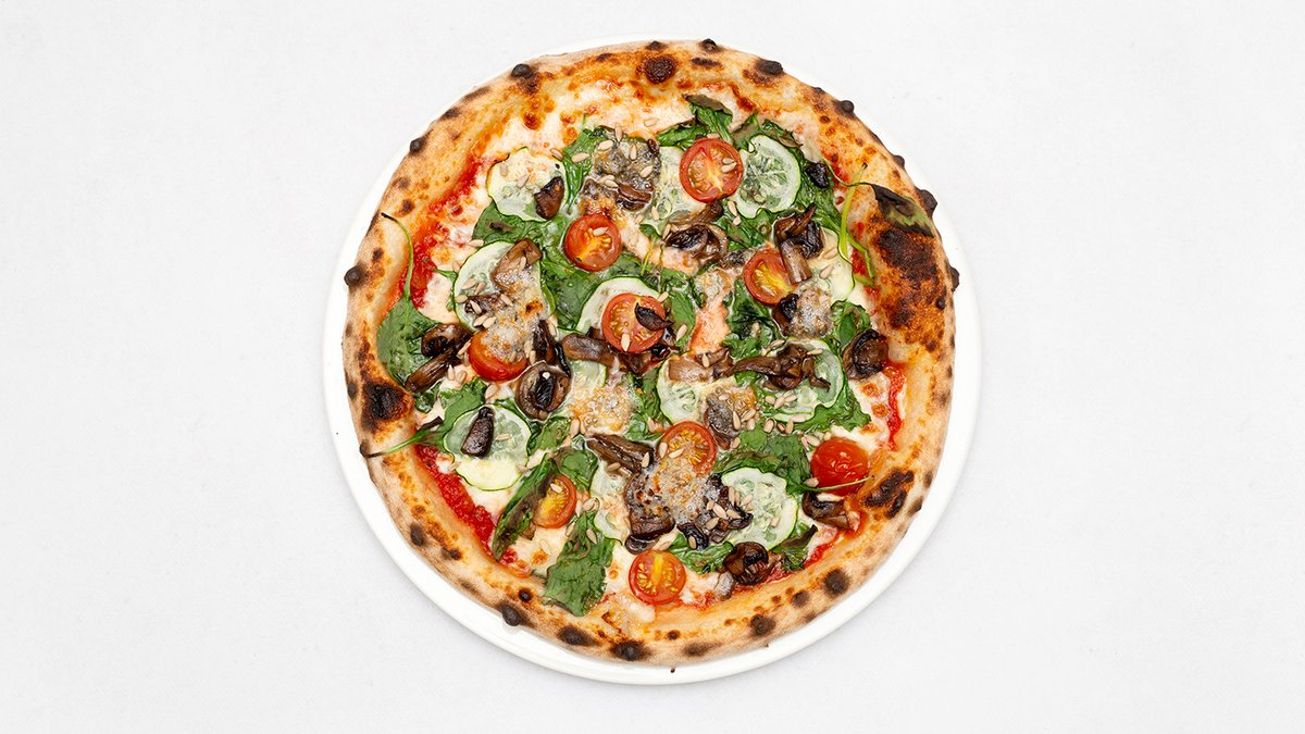 Sos pomidorowy, mozzarella fdl, szpinak, pieczarki, pomidorki, grillowana cukinia, gorgonzola, słonecznik