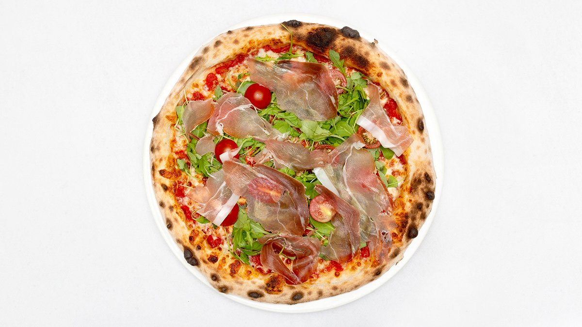 Sos pomidorowy, mozzarella fdl, pomidorki, rukola, szynka crudo, parmezan