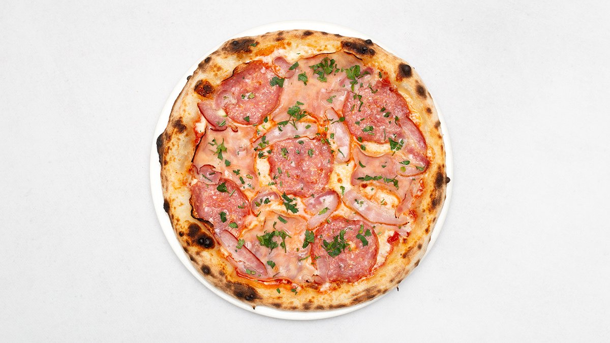 Sos pomidorowy, mozzarella fdl, salami milano, szynka cotto, boczek pancetta, natka pietruszki