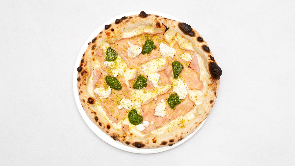 Sos śmietanowy, mozzarella fdl, szynka cotto, ricotta pesto bazyliowe, pistacje