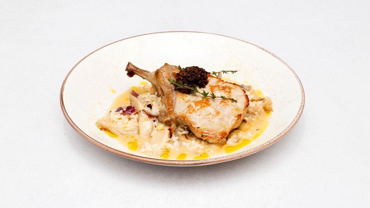 Grillowany schab z kością, boczniaki, czerwona cebula, czosnek, rozmaryn, pasta z czarnej trufli, pecorino romano