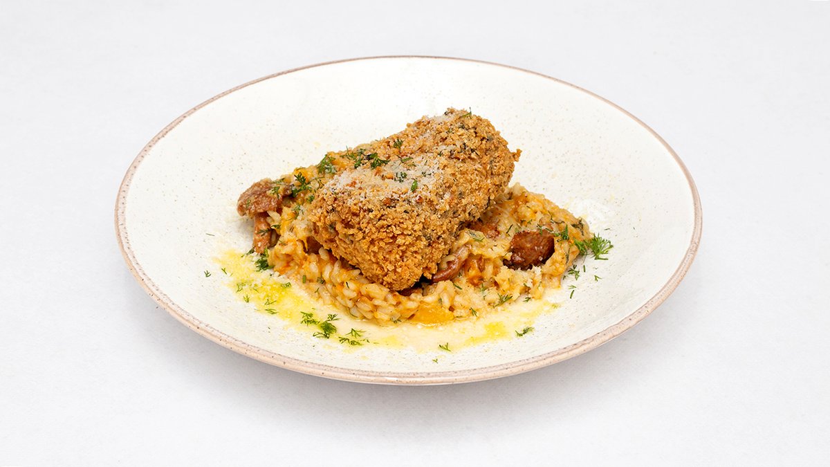 Polędwica z dorsza w panko ,dynia, kurki, koperek, czosnek, parmigiano romano