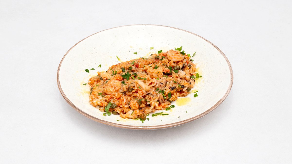 Kalmary, krewetki mule ośmiorniczki, sos pomidorowy kapary, czerwone wino, czosnek, natka pietruszki, pecorino romano