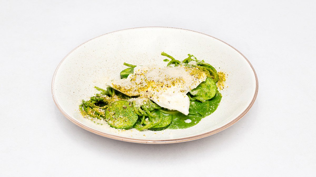 Pesto bazyliowe burrata cukinia pecorino romano, pistacje
