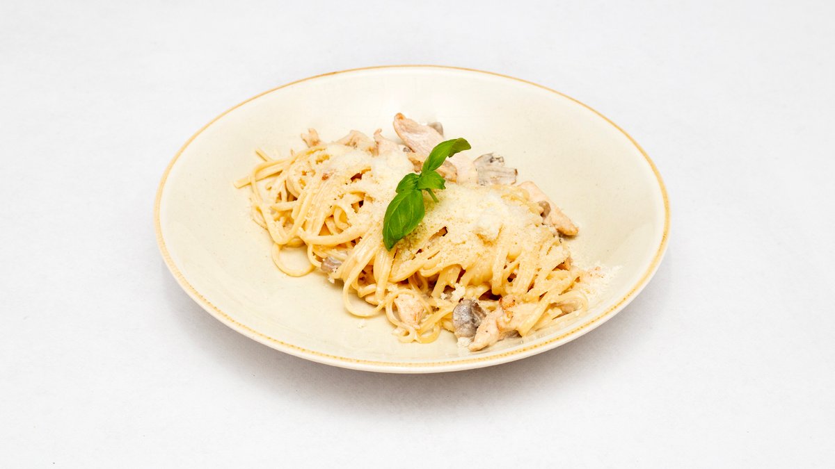Kurczak pieczarki czosnek, sos śmietanowy, pecorino romano, bazylia