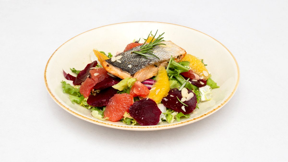 Pieczony filet z łososia, pomarańcza grejpfrut, pieczone burak płatki migdałów, rozmaryn, oliwa cytrynowo-miodowa