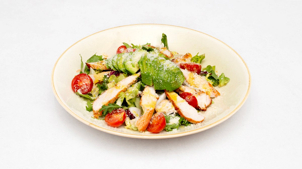 Grillowany filet z kurczaka, awokado, ogórek, pomidorki, sos miodowo-musztardowy, sałata rzymska pecorino romano