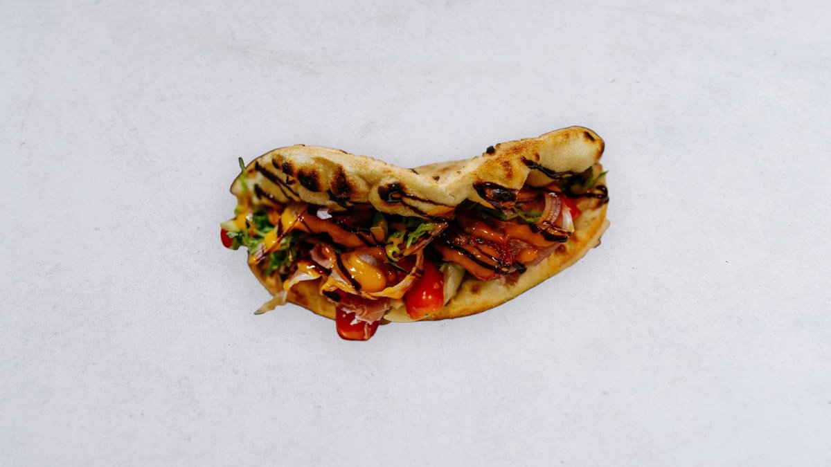 Pieczywo własnego wypieku, oliwa, ser ,rukola,cebula czerwona,pomidor,pikle,sos