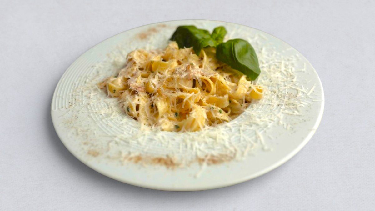 Makaron tagliatella, sos na bazie włoskiej śmietany, cebula, boczek