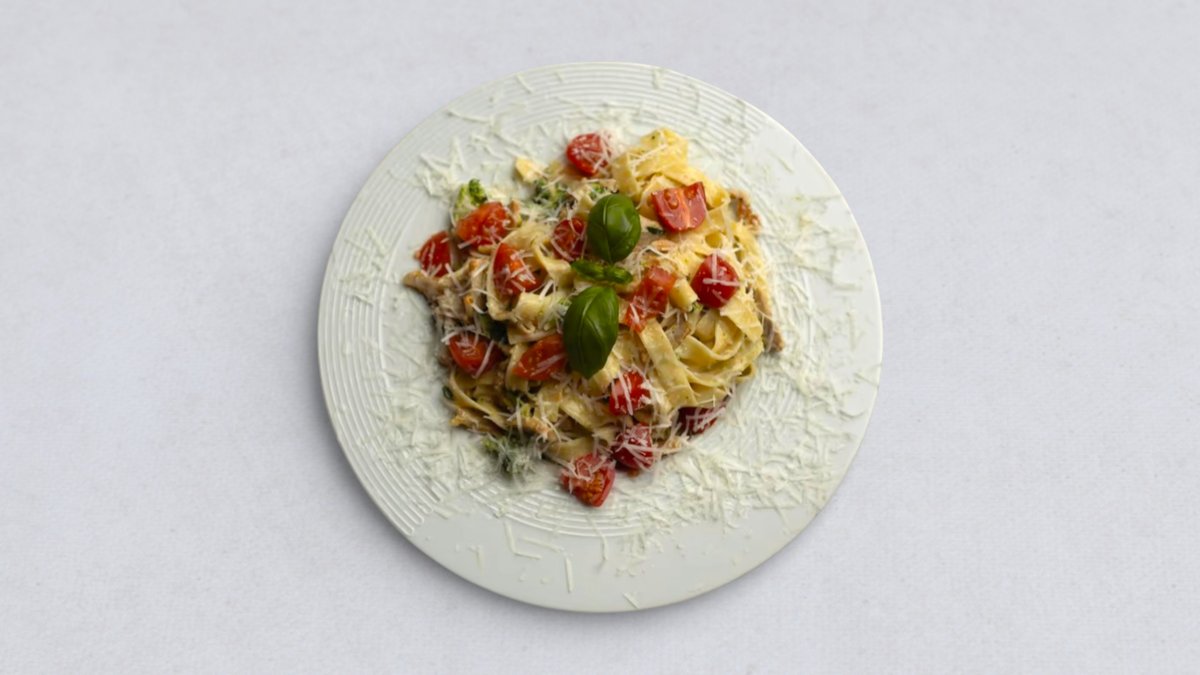 Makaron tagliatelle, sos na bazie włoskiej śmietany, kurczak, brokuł, pomidor koktajlowy, natka pietruszki, parmezan