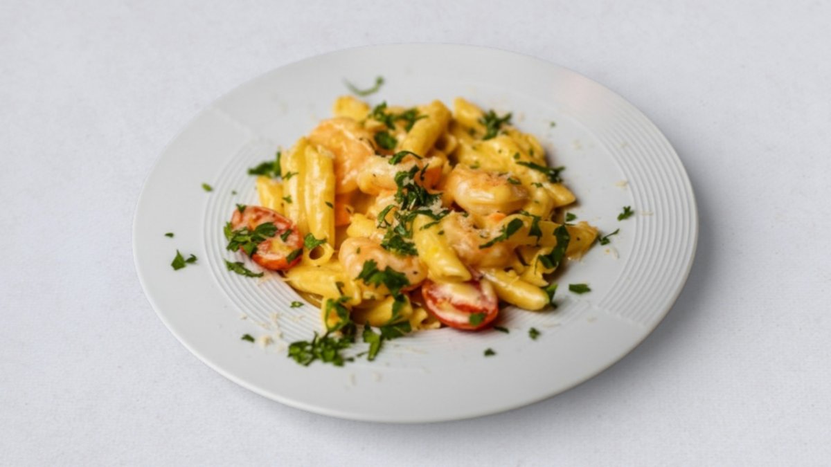 Makaron tagliatelle, sos na bazie włoskiej śmietany, krewetki, czosnek, skórka i sok z cytryny, natka pietruszki