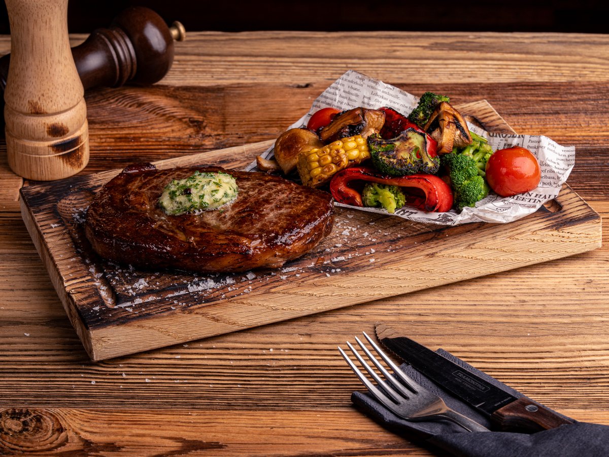 Dojrzały stek z ribeye. Podawane z masłem czosnkowym i grillowanymi warzywami.
