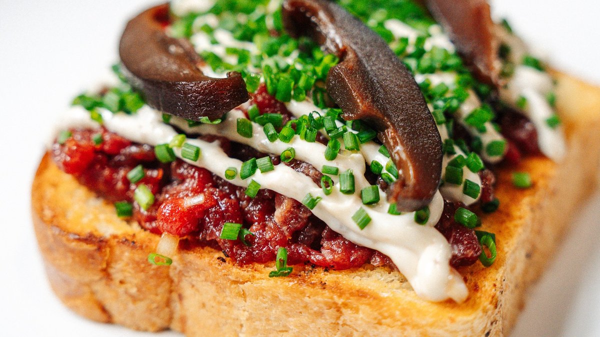 wołowina / marynowane grzyby shitake / mayo truflowe / szalotka / szczypiorek / maślany chleb tostowy