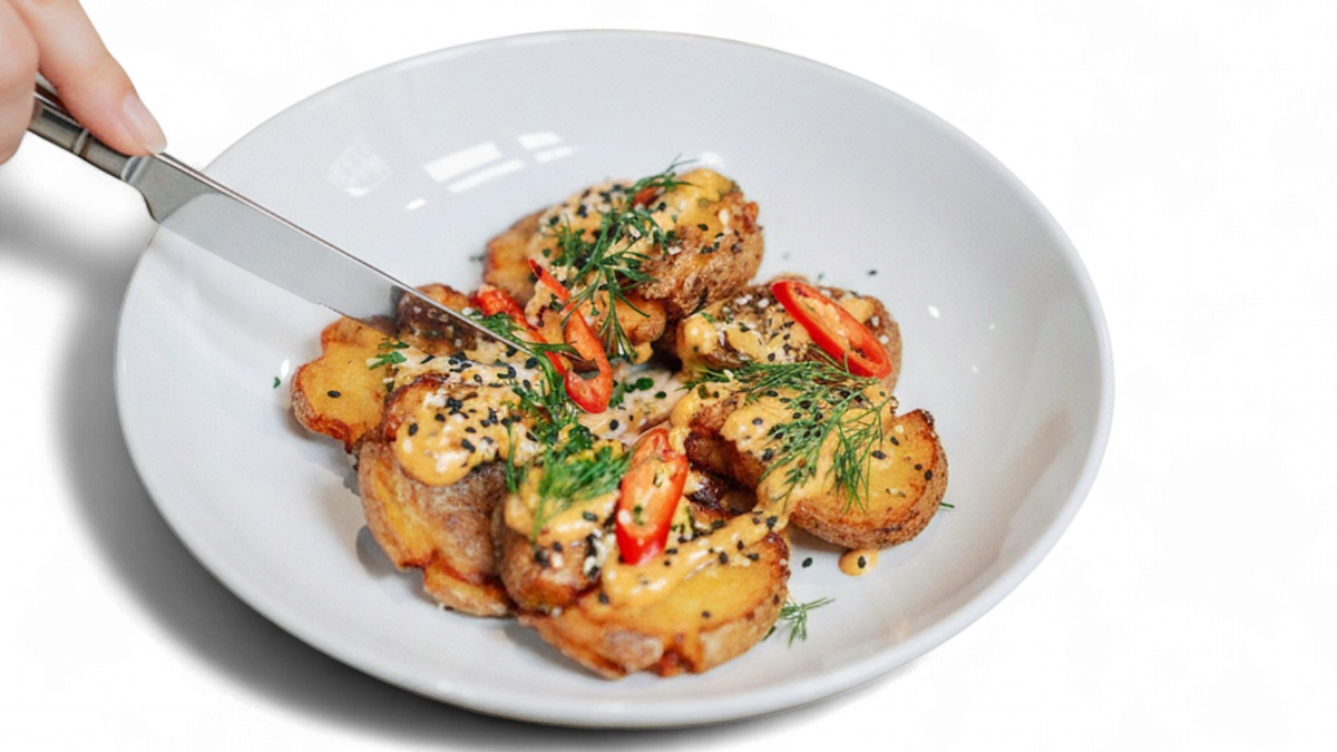 Chrupiące ziemniaczki / sos tahini / chilli / sezam / koperek / szczypiorek