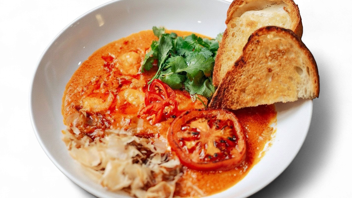 6x krewetka / mleko kokosowe / pomidory / katsoubushi / chilli / kolendra / chleb tostowy