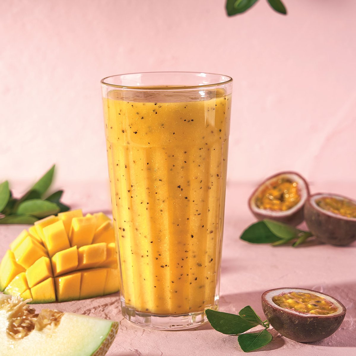 Orzeźwiające połączenie espresso z świeżo wyciskanym sokiem pomarańczowym i puree mango.