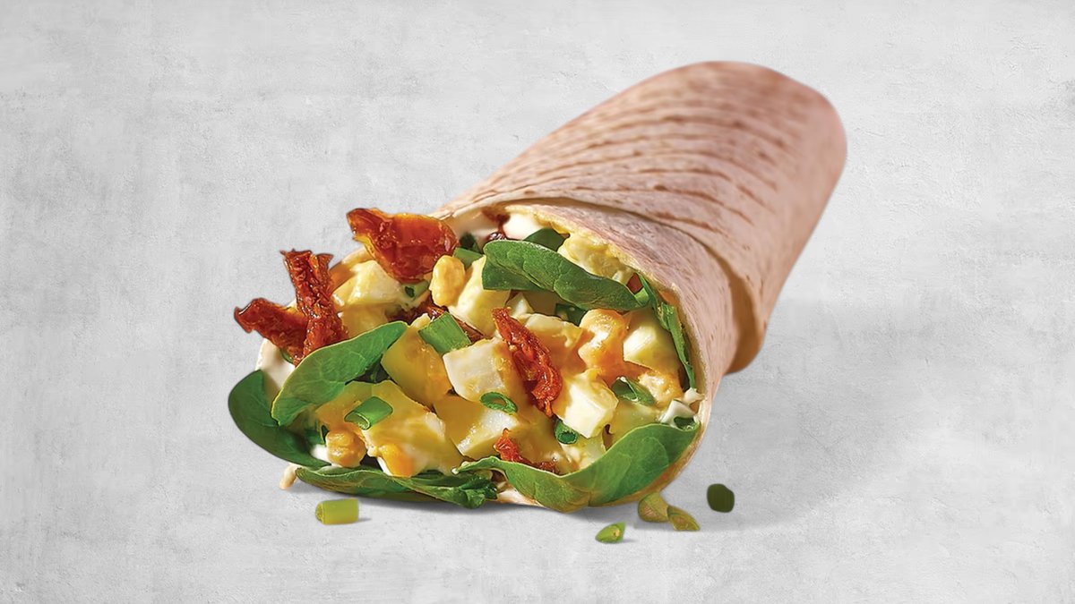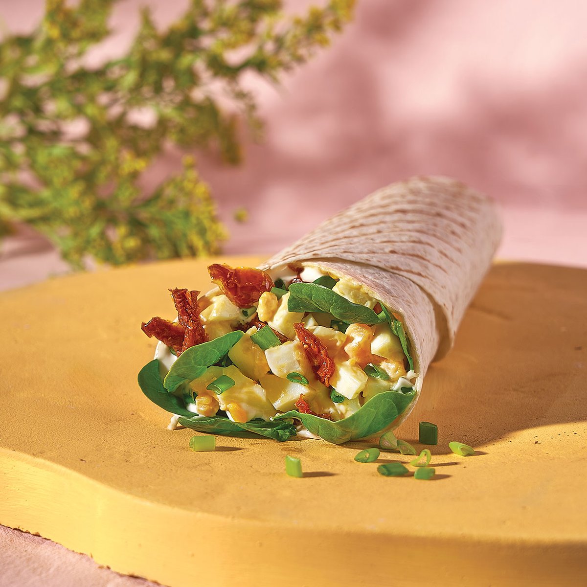 WRAP Z PASTĄ JAJECZNĄ, SUSZONYMI POMIDORAMI, SZPINAKIEMI I SZCZYPIORKIEM