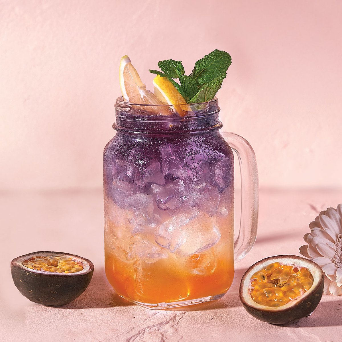 Lemoniada cytrynowa z naparem z werbeny, ashwagandy, mięty oraz suszonych kwiatów Clitoria ternatea. Zdjęcie poglądowe.