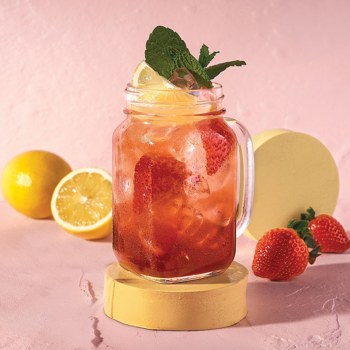 Lemoniada, który łączy w sobie soczystą słodycz dojrzałych truskawek i orzeźwiającą cytrusową świeżość przygotowana na bazie puree truskawkowego z dodatkiem truskawek, mięty i cytryny, ukoi pragnienie w gorące dni.