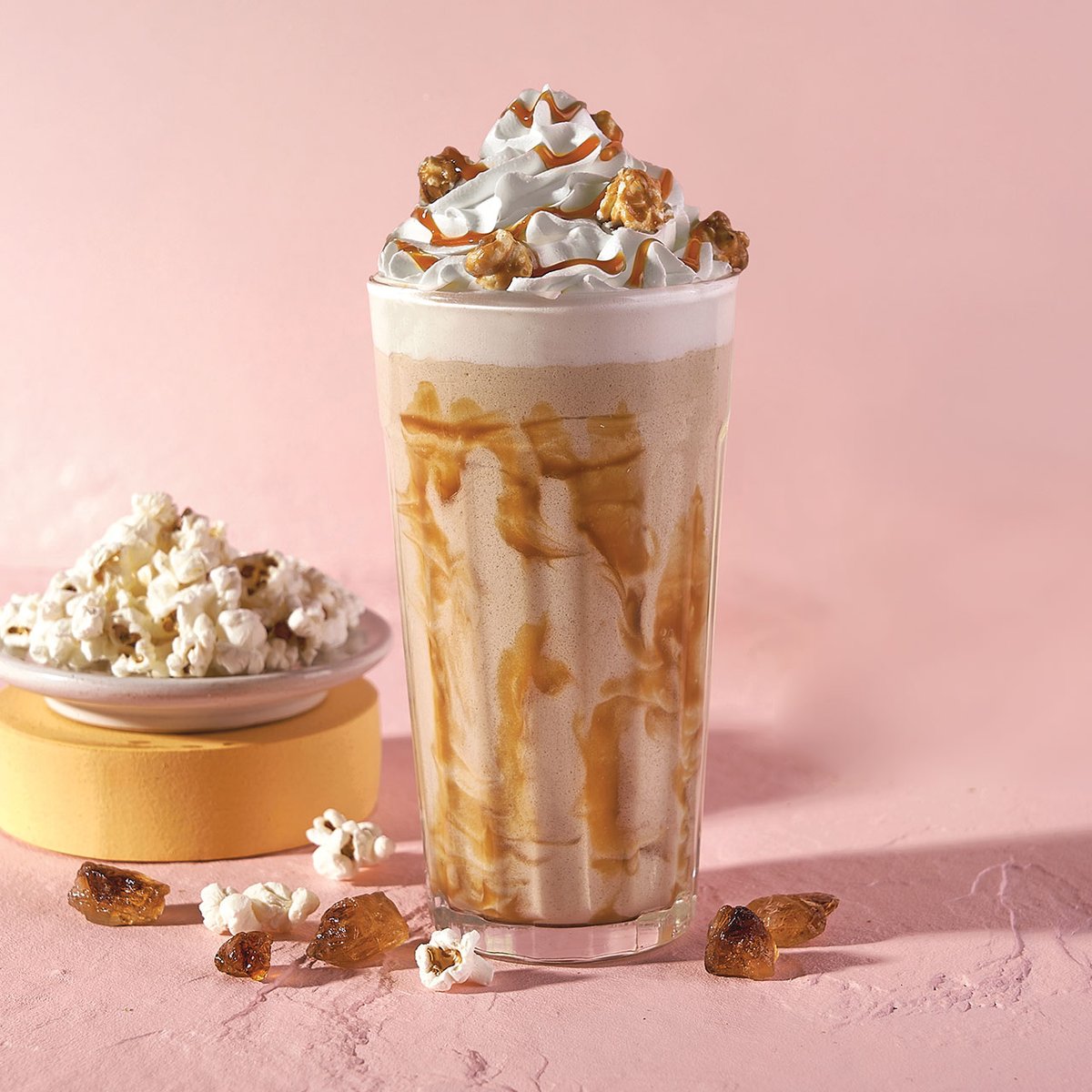 Mrożona kawa mleczna z nutą słodko-słonego karmelowego popcornu z bitą śmietaną to idealna propozycja na ciepłe dni oraz przepyszny wybór na kawowy deser.