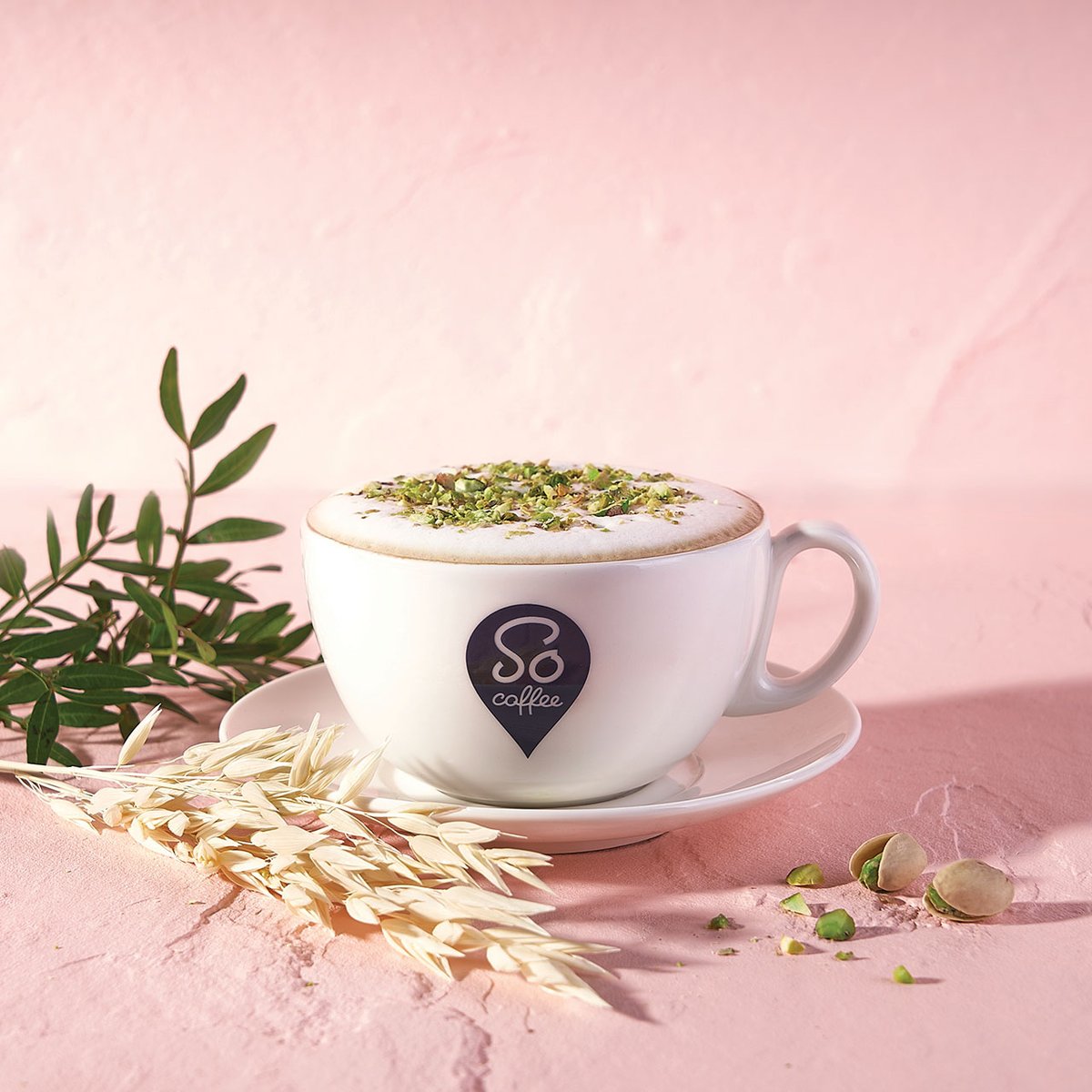 Cappuccino na pojedynczym espresso z dodatkiem włoskiego sosu z pistacji. Mleczna pianka posypana jest prawdziwymi pistacjami- pobudzający deser, który sprawia ogromną radość.