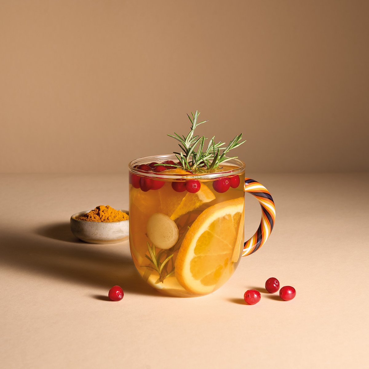 Moc naturalnych składników w jednej szklance! Napar na bazie mieszanki w której skład wchodzi imbir, kurkuma, trawa cytrynowa i goździki, wzbogacony miodem, świeżymi plastrami imbiru, żurawiną oraz soczystą pomarańczą. Całość dopełnia aromatyczna gałązka rozmarynu. To prawdziwa bomba odpornościowa i chwila ukojenia w jednej porcji.