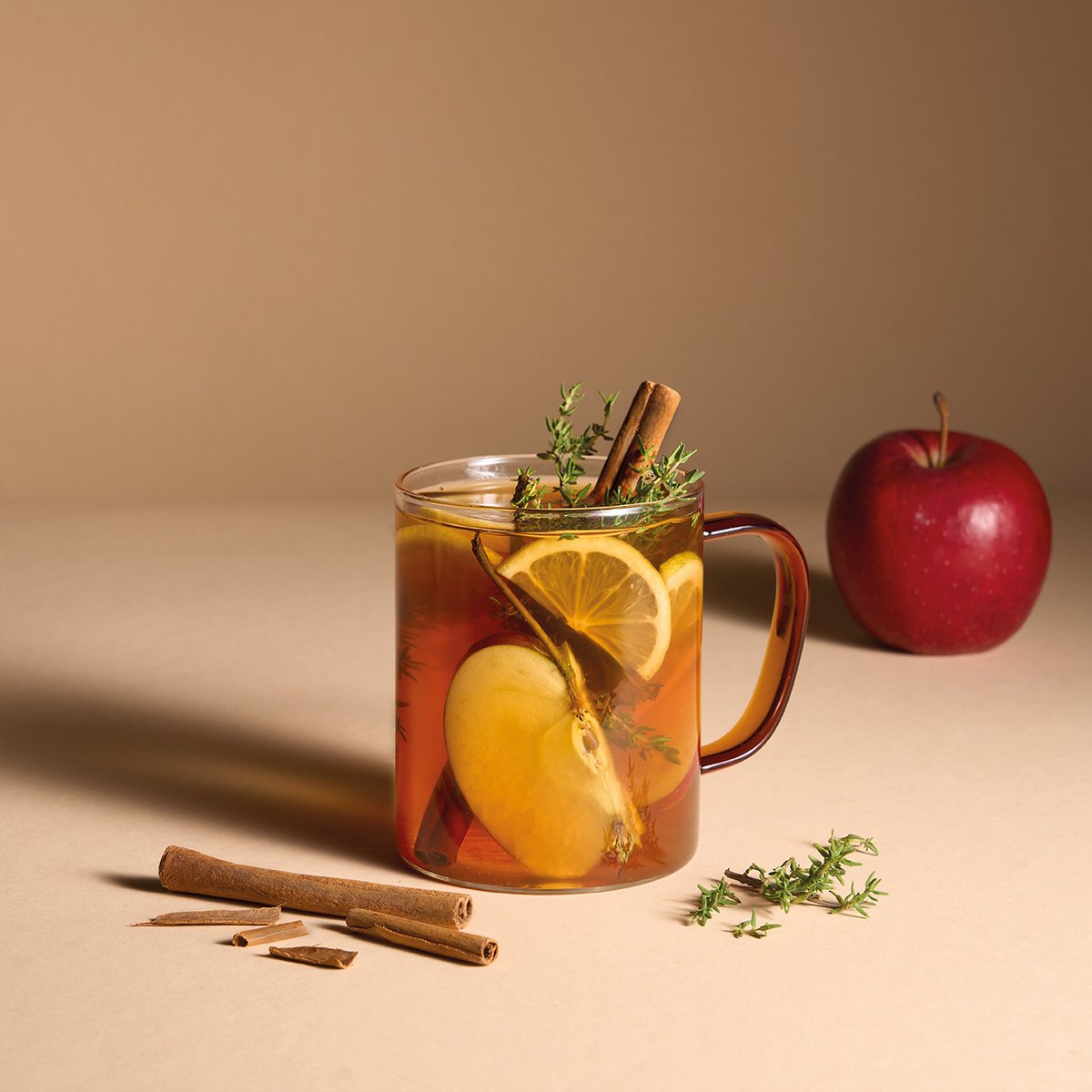 Rozgrzewająca herbata inspirowana smakiem domowej szarlotki. W szklance znajdują się jabłko, syrop o smaku szarlotki, naturalny miód, plaster cytryny, laska cynamonu i gałązka świeżego tymianku. Idealna na chłodne dni – pachnie jak świeżo upieczone domowe ciasto!