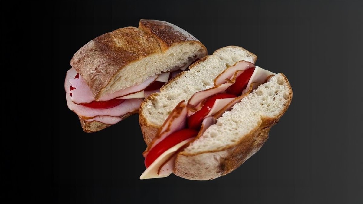 Pâine Ciabatta proaspătă 100gr , cremă de brânză 25gr , mușchiuleț 30gr , roși 30gr cașcaval 30gr