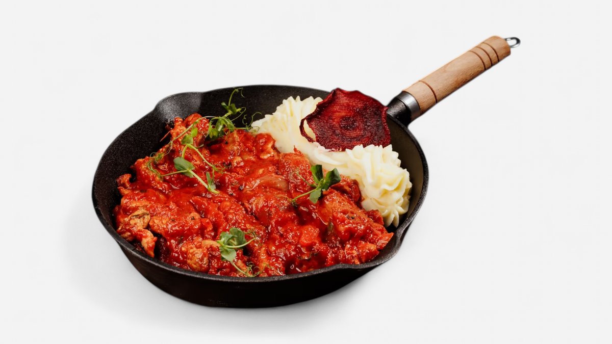 250gr - Pulpă de vită Black Angus, pastă de ardei, pastă de roșie, cimbru, ulei măsline, năut fiert tahini, usturoi, pătrunjel, rodie, ceapă shalota, ardei roșu, roșii, cartofi proaspeți, orez basmatic, ardei iute, varză roșie, salată iceberg, lămâie, lipie