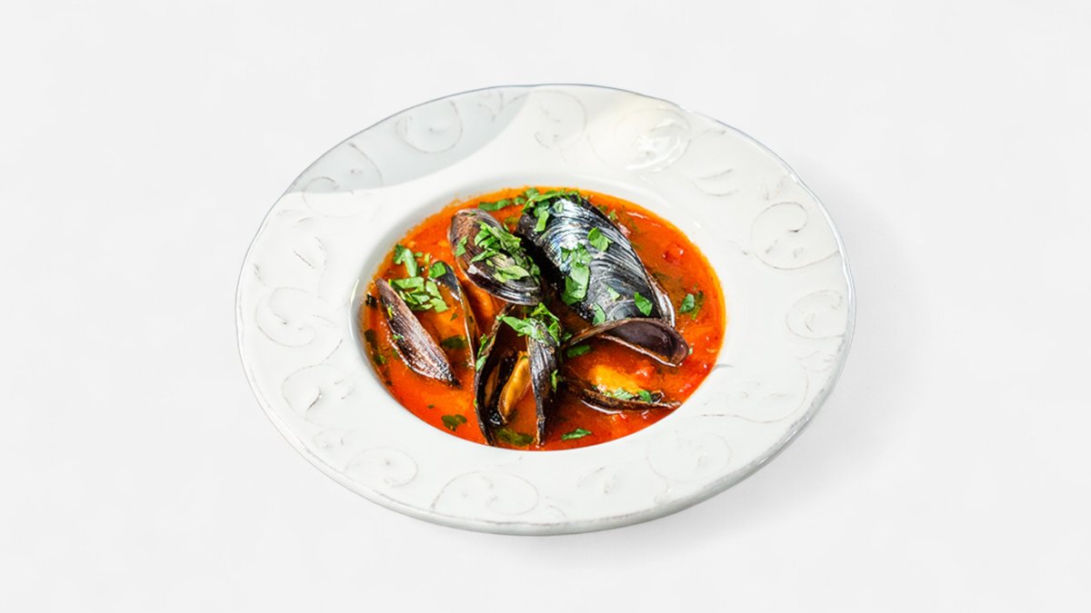 450 gr- Midii, chorizo, ulei de masline, ceapa usturoi, sos de rosii, patrunjel, unt, sare, piper