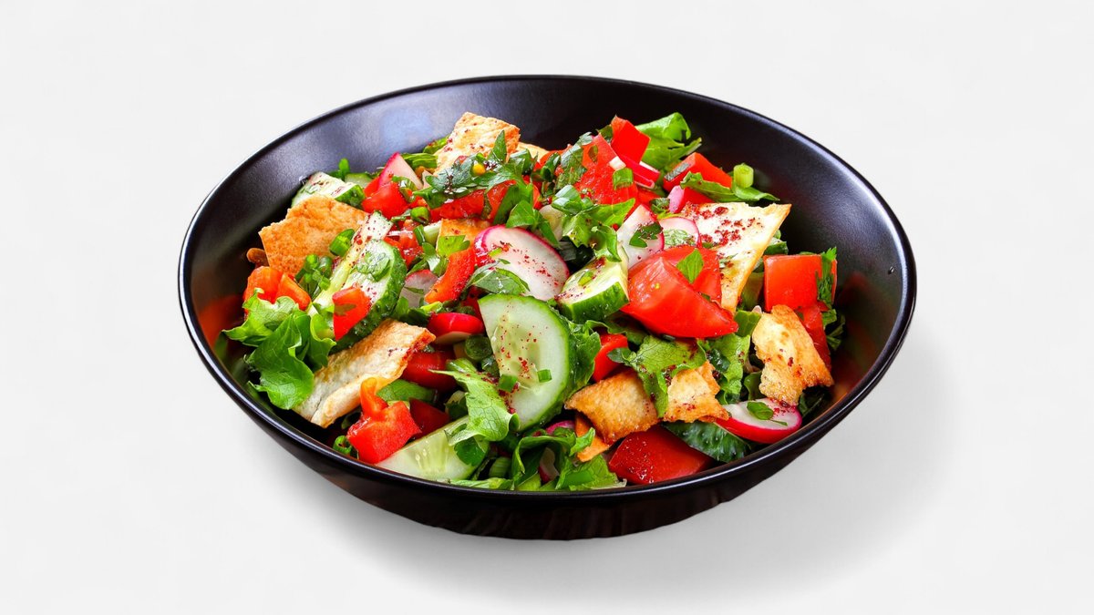 250 gr- salata verde, patrunjel, rosii, ceapa rosie, usturoi, lamaie, ulei de masline, sumac, lipie, sos rodie, ridiche, sare, piper