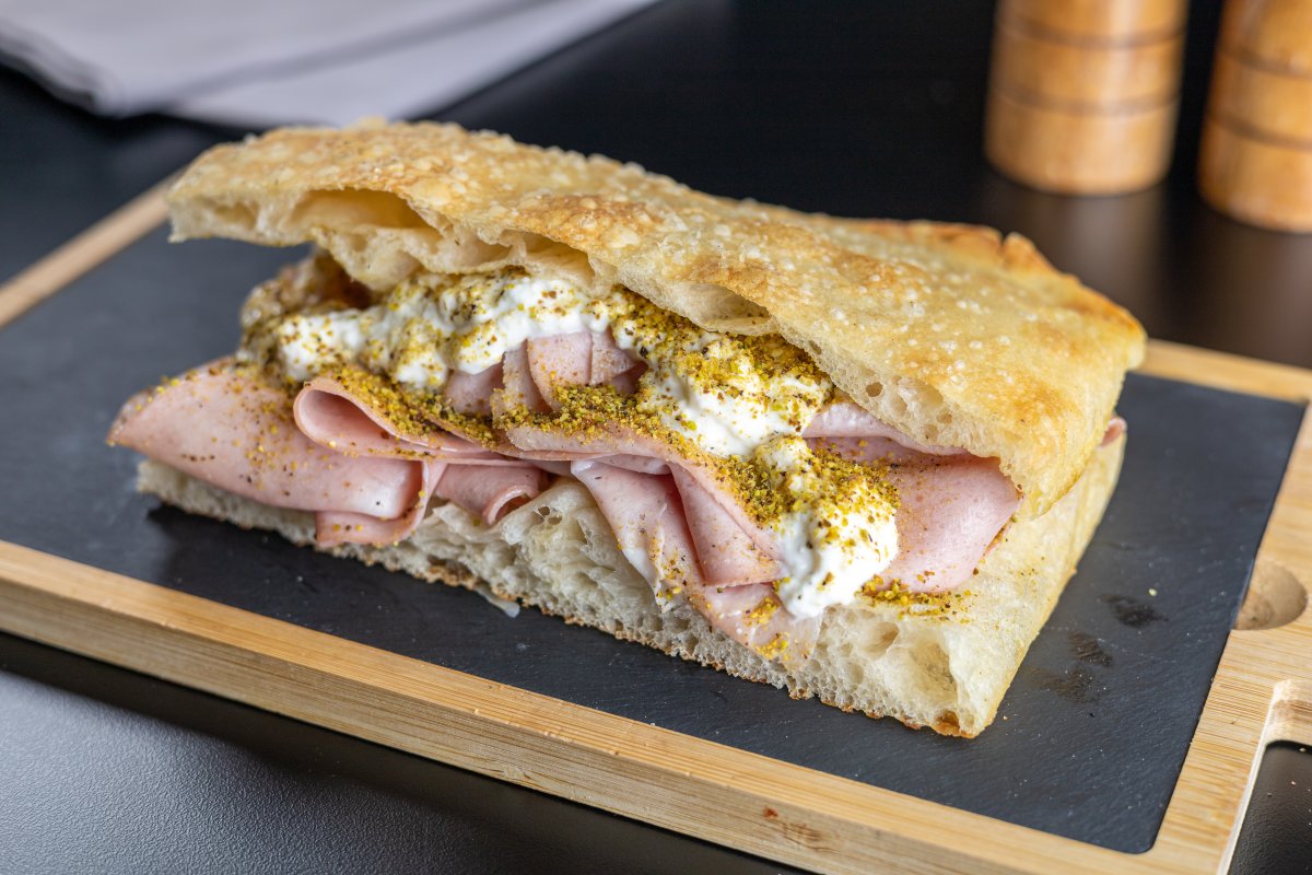 Blat pizza Artizanal, sos de smântână vegetală, mozzarella, mortadella cu fistic, fistic granulat